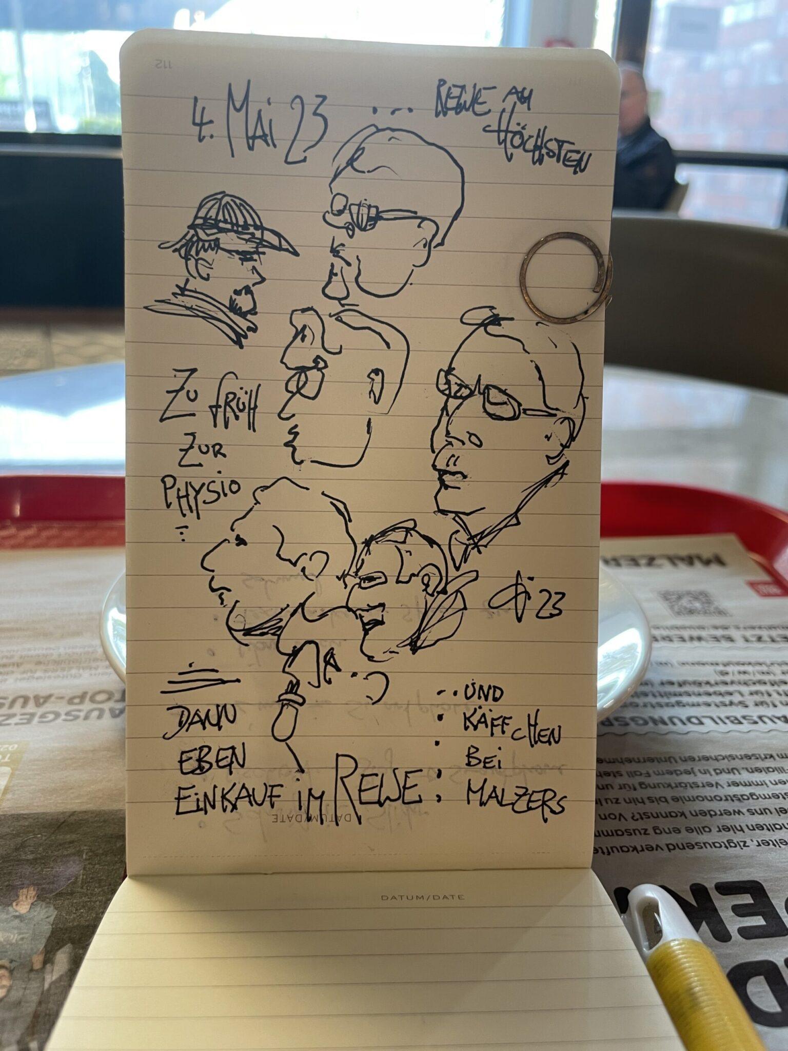 Termin verpeilt von Guido Wessel | Mai 4, 2023 | Allgemein | 0 Kommentare Eine Stunde zu früh bei der Physio. Zeit für Einkauf, Käffchen und Skizze genutzt. Zeichnen geht immer. Egal womit, egal wo drauf. Kommentar absenden Antwort abbrechenDu musst angemeldet sein, um einen Kommentar abzugeben.