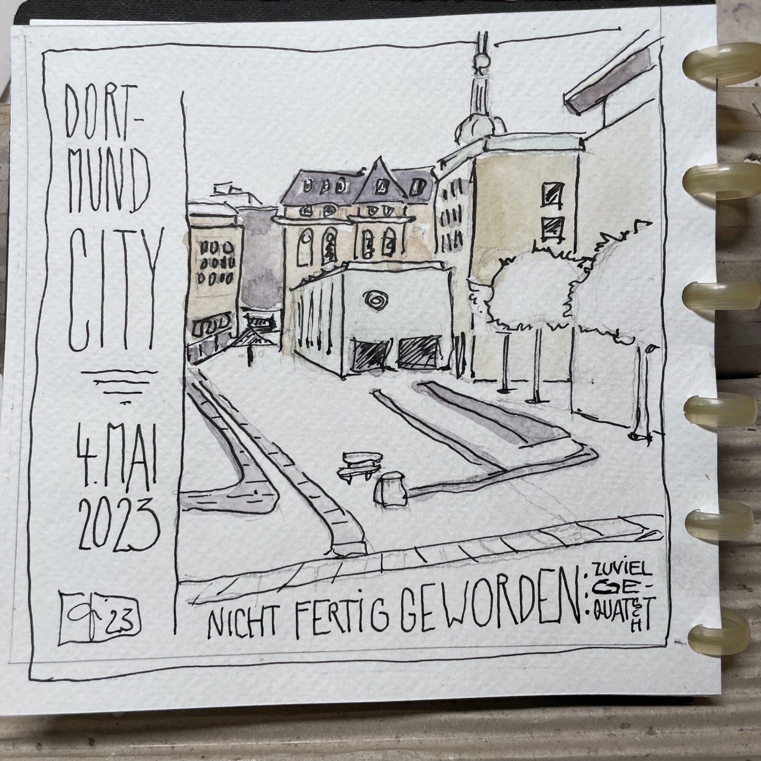 Mit 23 Zeichnerinnen und Zeichnern zur Betenstraße in Dortmund. Viele Sitzgelegenheiten und rundum interessante Motive. Allerdings auch interessante Gespräche mit Passanten. Bin nicht fertig geworden. Nur Bleistift und erste Schicht Farbe. Zuhause dann einfach nur noch die Konturen nachgezogen.