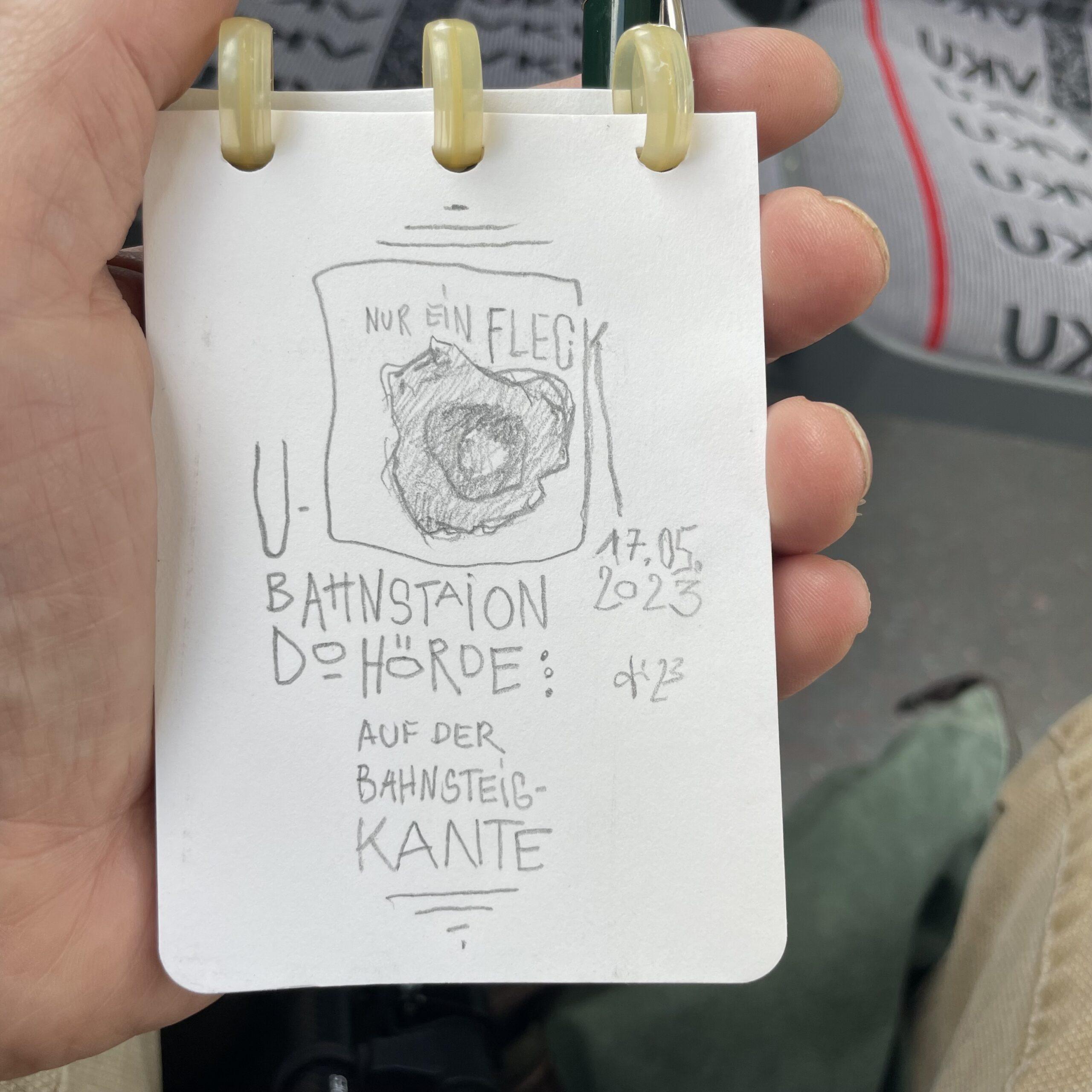 Kurze Wartezeit in der U-Bahn. Einfaches irrationales Motiv: Fleck auf der Bahnsteigkante. Mit Text anschließend aufgehübscht.