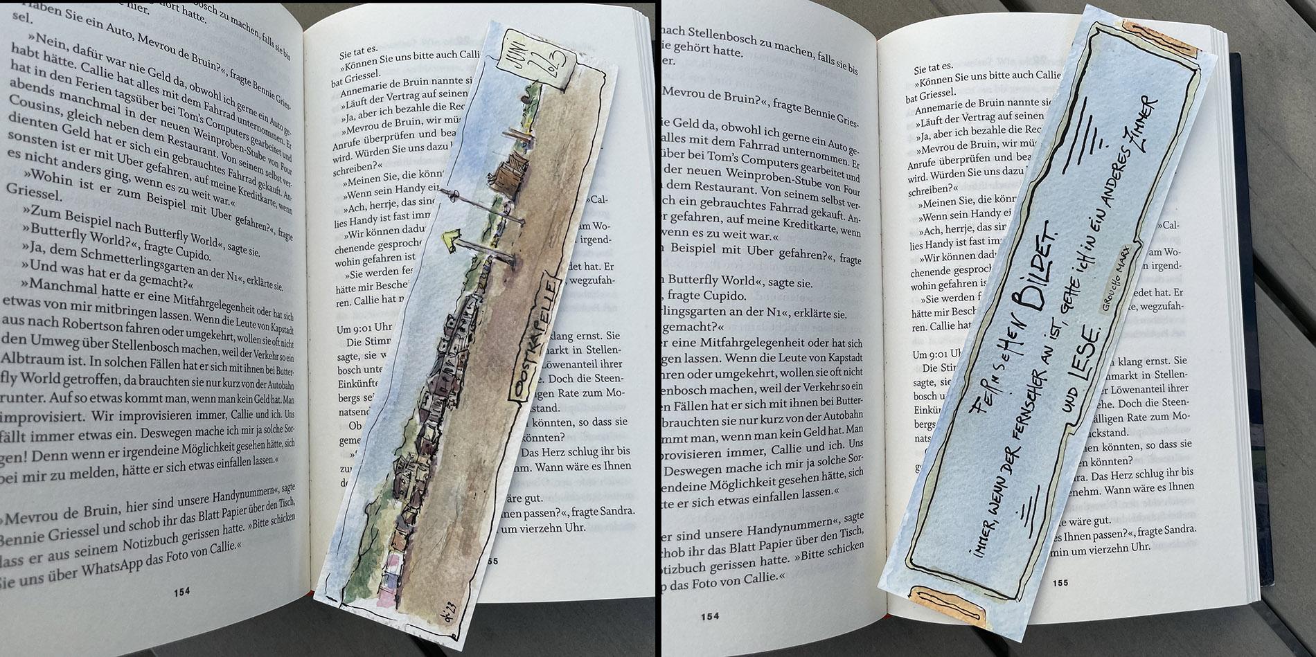 Lesezeichen, die Zweite von Guido Wessel | Juni 7, 2023 | Allgemein | 0 Kommentare 25 x 5 cm ist schon ein schwieriges Format. Lohnt sich aber. Lesen macht mit einem schönen Lesezeichen mehr Spaß. Aquarellkarton 246 g, USk-Farben von Roman Szmal Kommentar absenden Antwort abbrechenDu musst angemeldet sein, um einen Kommentar abzugeben.