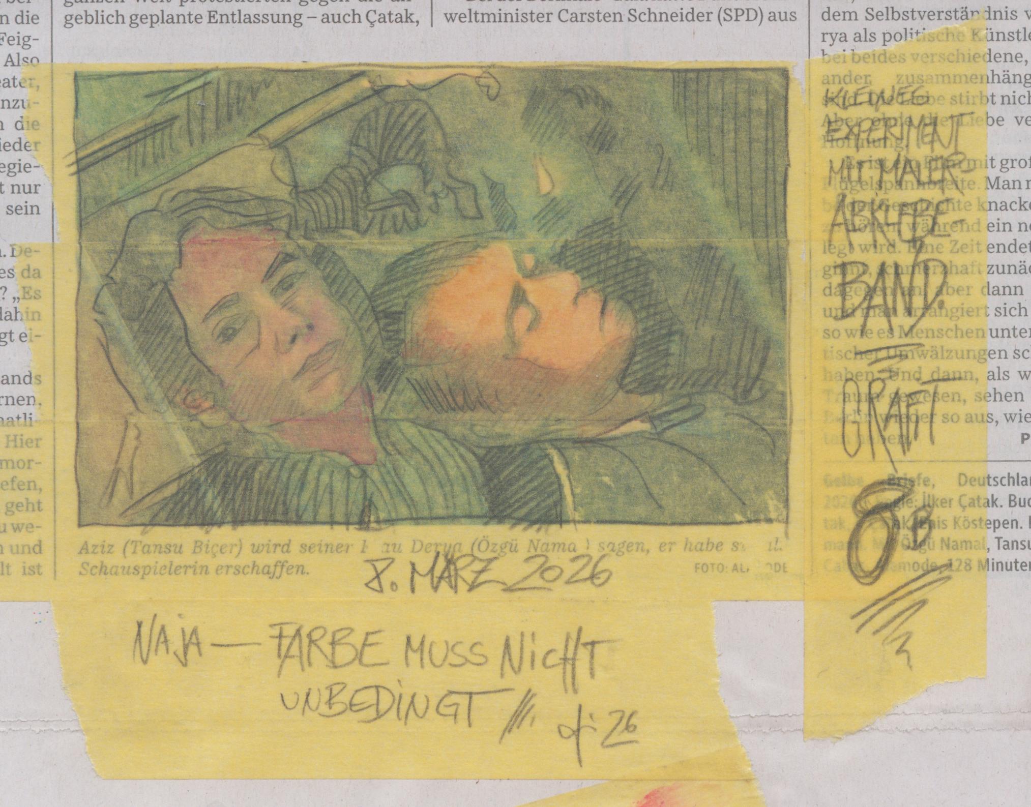Ich suche immer nach einfachen Zeichenmethoden. Hier habe ich ein Foto aus einer Zeitung mit Malerband beklebt und dann mit meinem 8B-Grafitstift darüber gezeichnet.