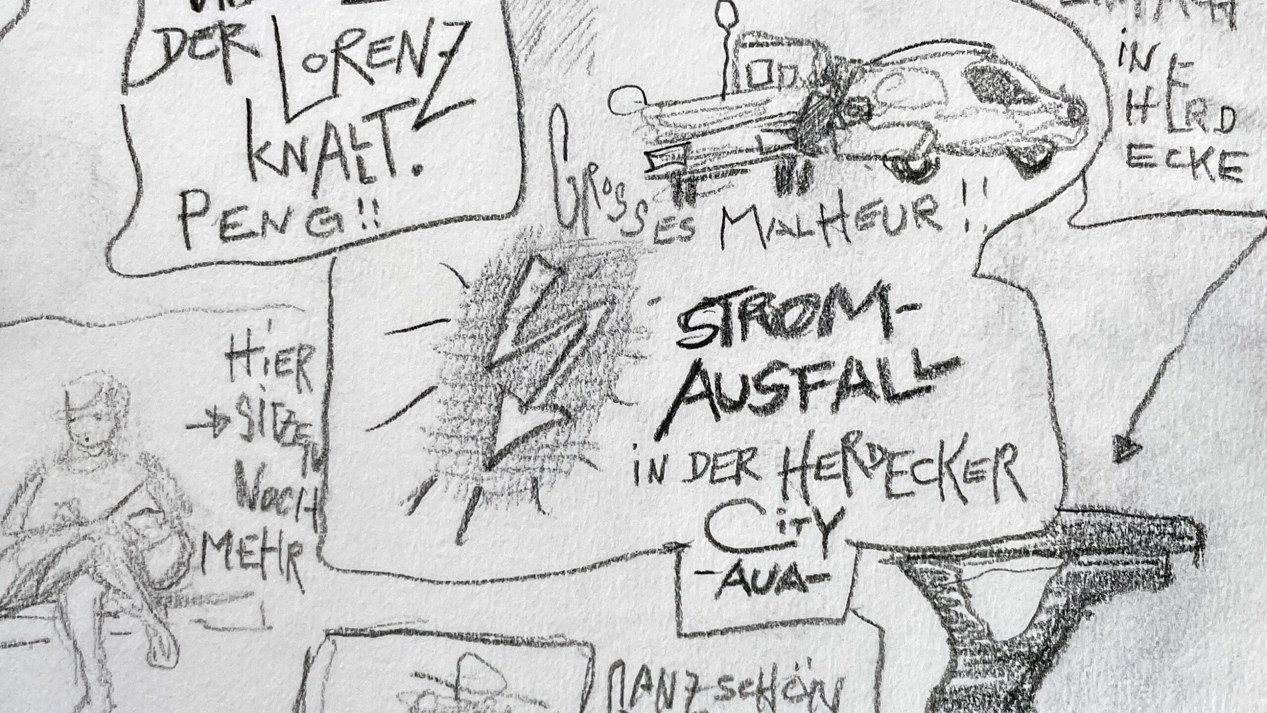 Material: Kuli und ein einfacher Zettel reichen schon. Ansonsten geht alles, womit man spontan überall loszeichnen kann. (Bierdeckel, Zeichenblock, Aquarell, Kaffee, Bleistift, Lippenstift – was auch immer.)