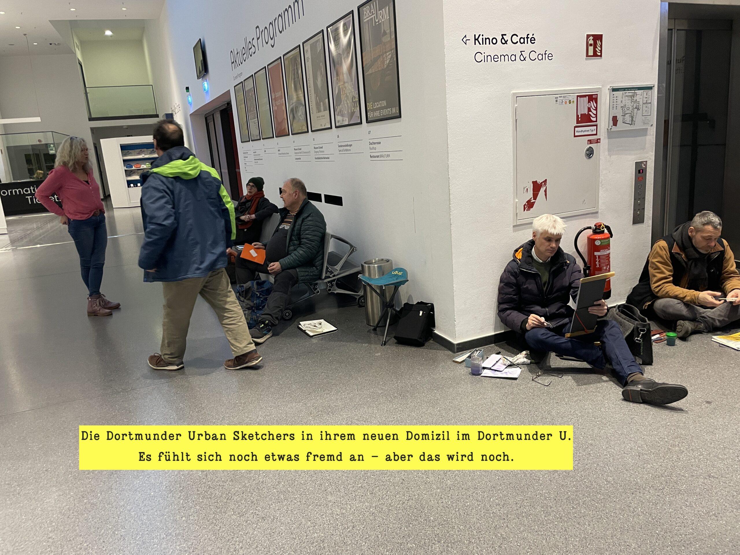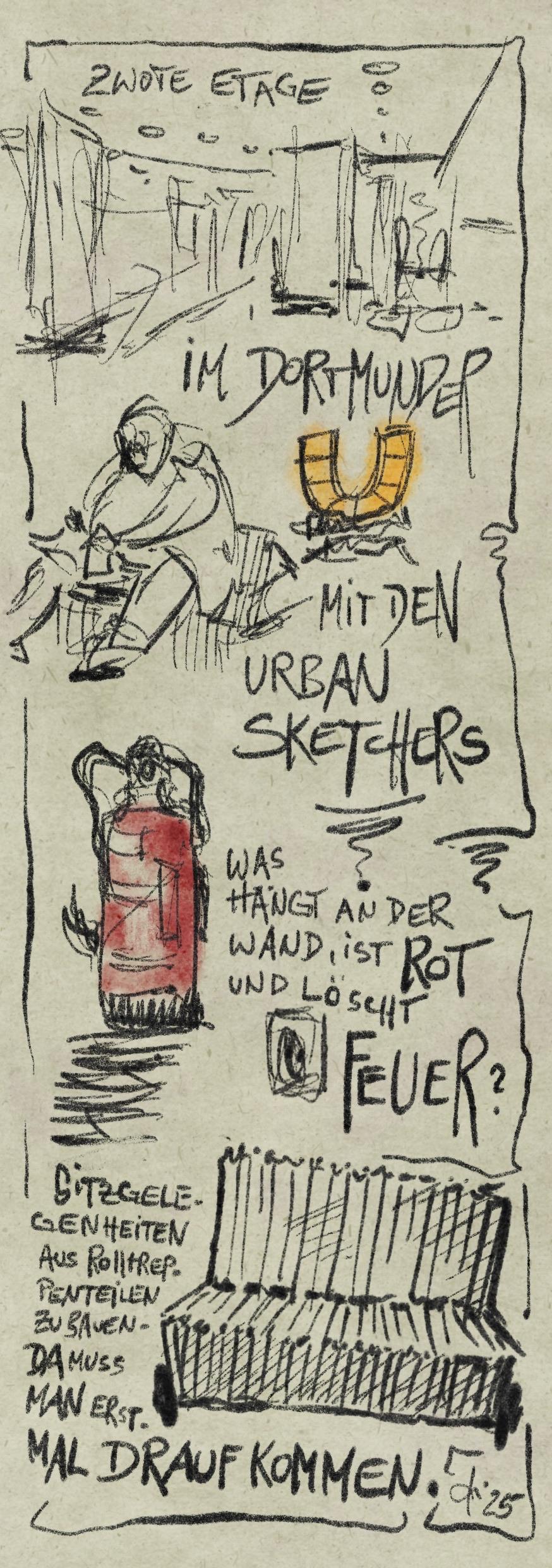 Das erste Mal am neuen Standort der Dortmunder Urban Sketchers im Dortmunder U. Ich bin seit 2016 in der Gruppe aktiv. Bisher hatten wir unseren Standort im Museum für Kunst und Kulturgeschichte. Das steht nun aber wohl kurz vor der Sanierung und Umbau.