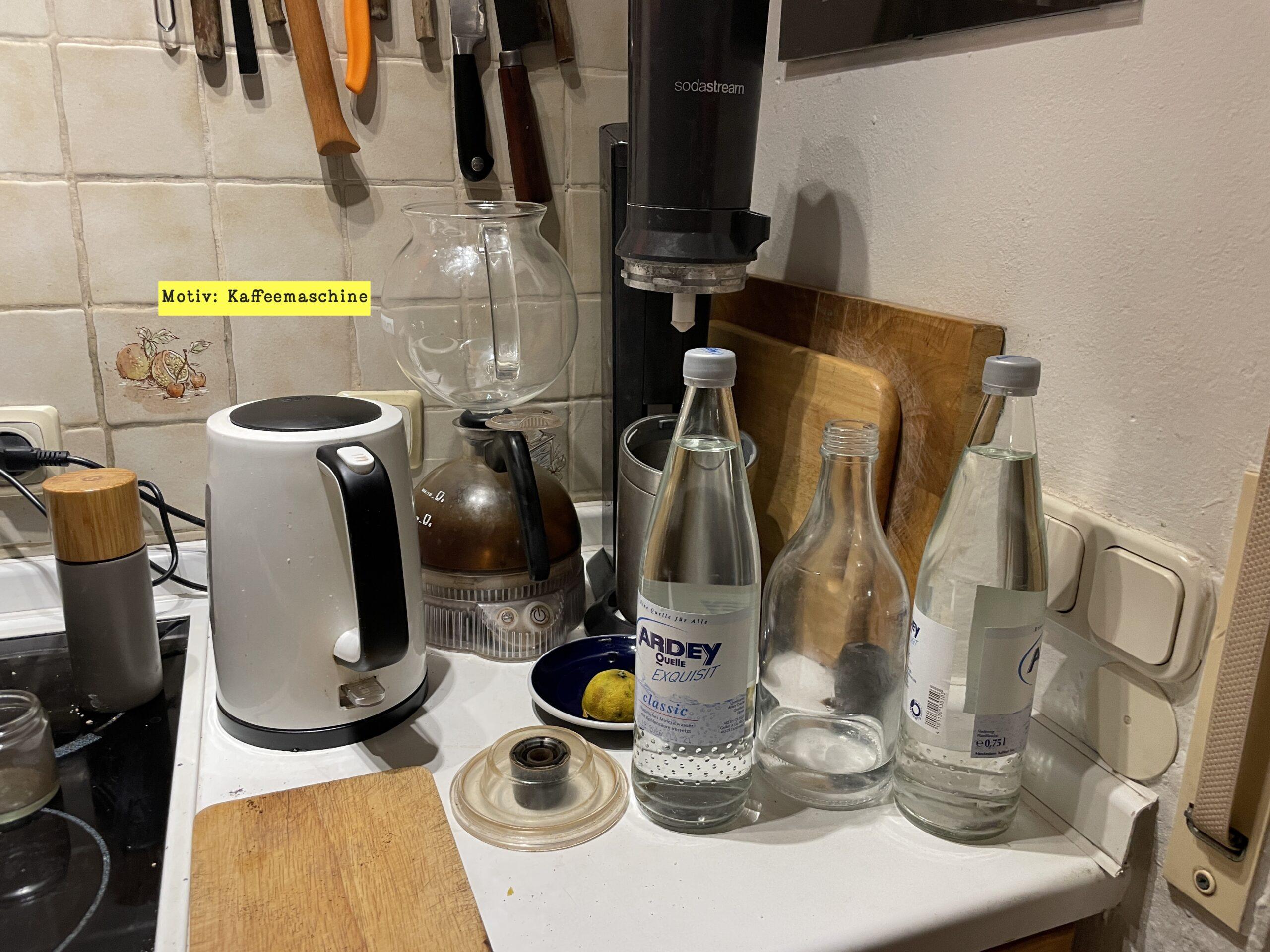 Ich habe mir mal wieder eines meiner Lieblingsmotive aus der Küche geschnappt. Die Kaffemaschine hat einfach schöne Formen. Ich zeichne das, was ich mag oder aber mich besonders herausfordert. Habe die Skizze später noch etwas ergänzt.