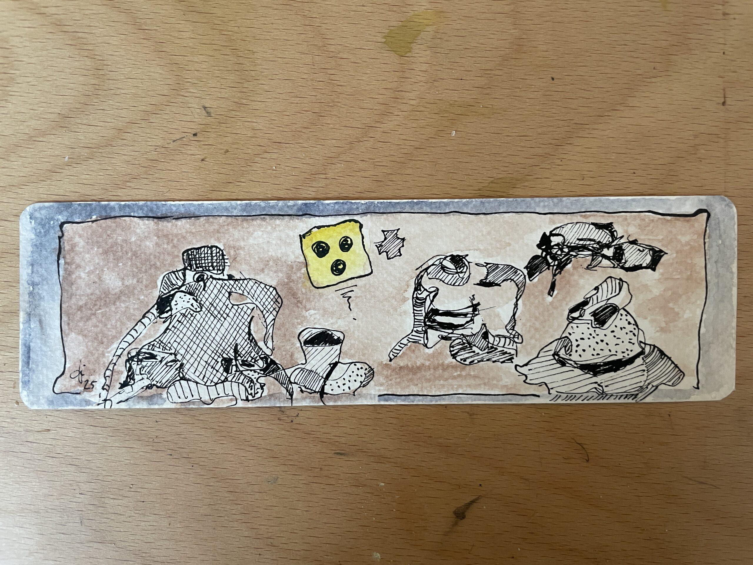 Idee der Teilnehmerinnen am Schreibzeichnenworkshop im Café am Mergelteich: Wir gestalten Lesezeichen mit Text und Zeichnung. Diese platzieren wir in Bibliotheken und anderen Orten mit Bezug zu Büchern. Wer eines findet, darf es behalten. So machen wir einerseits fremden Menschen Freude und lernen andererseits "loszulassen".