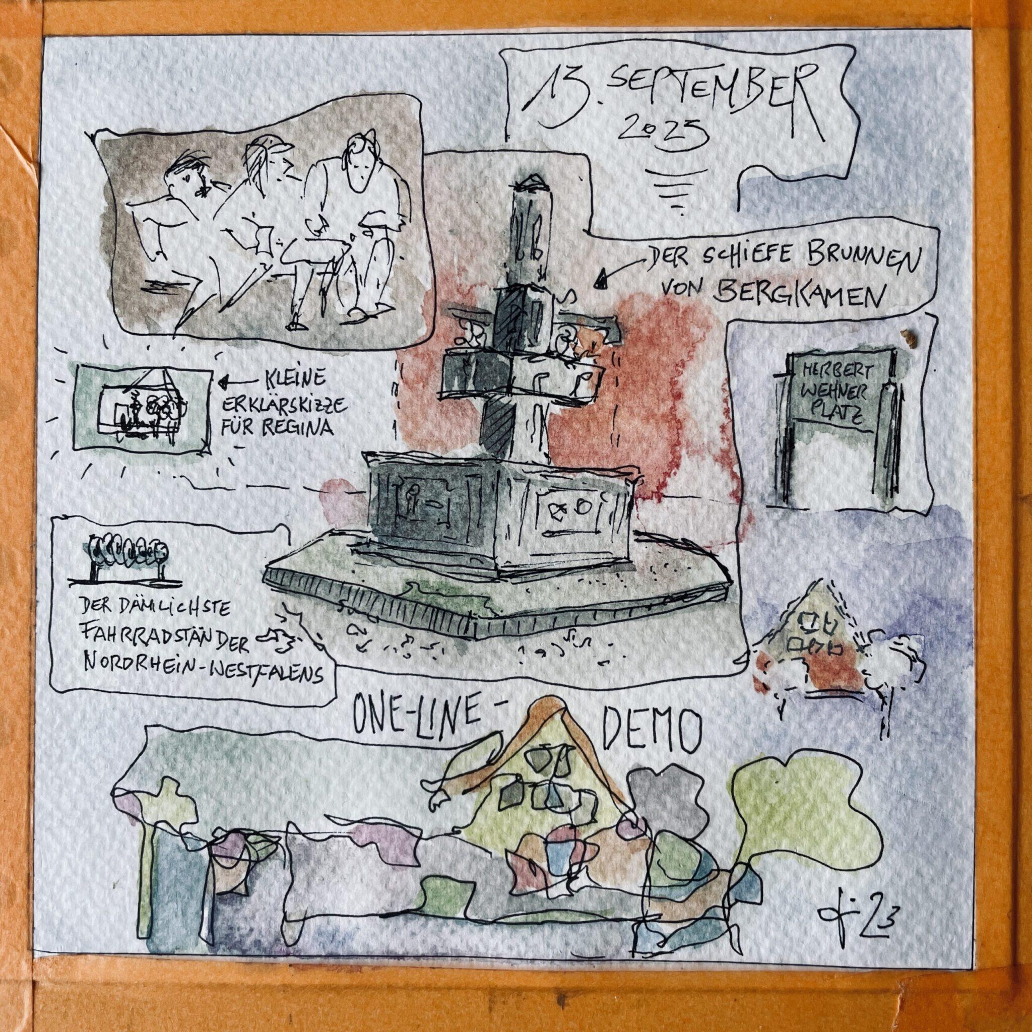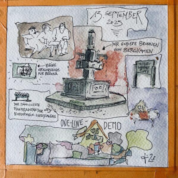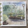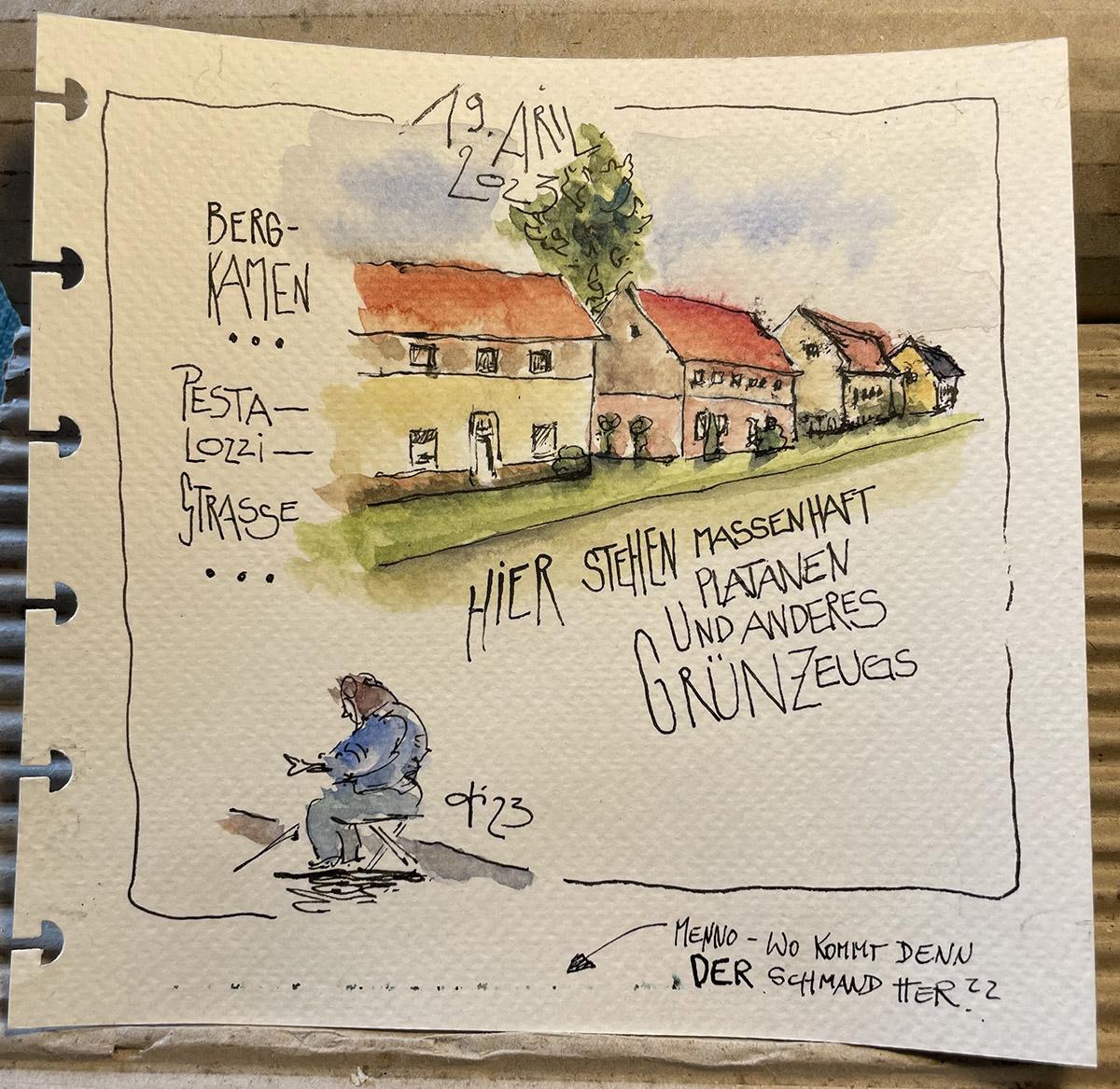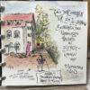 Die Zeichnungen sind während der Urban-Sketching-Workshops entstanden. Mir geht es garnicht darum, ein „perfektes“ Bild zu schaffen. Ich möchte vielmehr zeigen, was ich in dem Moment sehe und fühle. Ich verquicke dazu Bild und Text mit . der Schreibzeichnen-Methode.