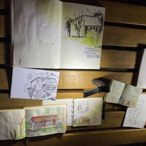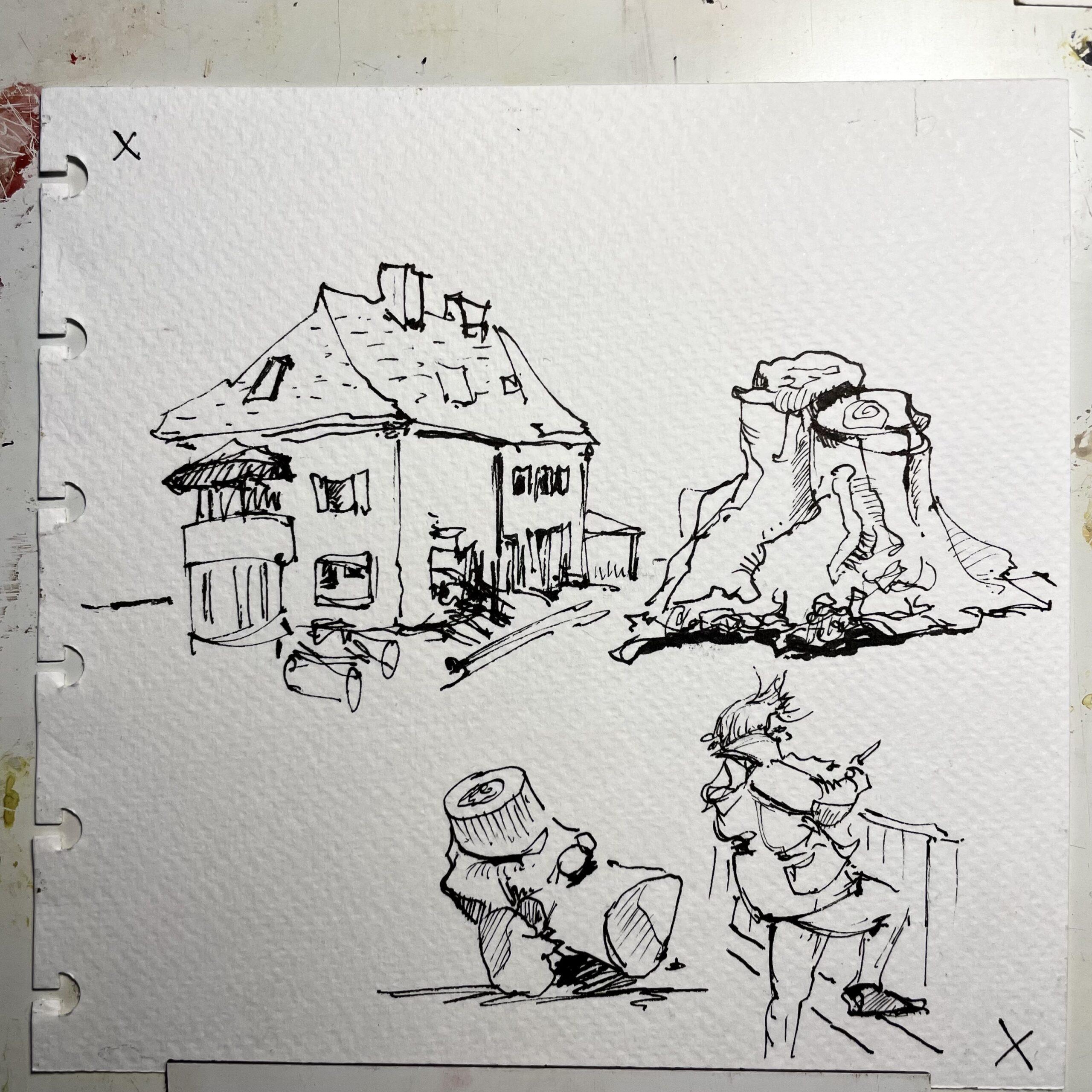 Meistens zeichne ich in mein Atoma-Skizzenbuch. Dort kann ich beliebiges Papier einheften. Meine Zeichenmedien sind Aquarell, Wassertankpinsel, Füllhalter und Grafit. Mitunter zeichne ich auch mit “procreate” auf dem iPad.