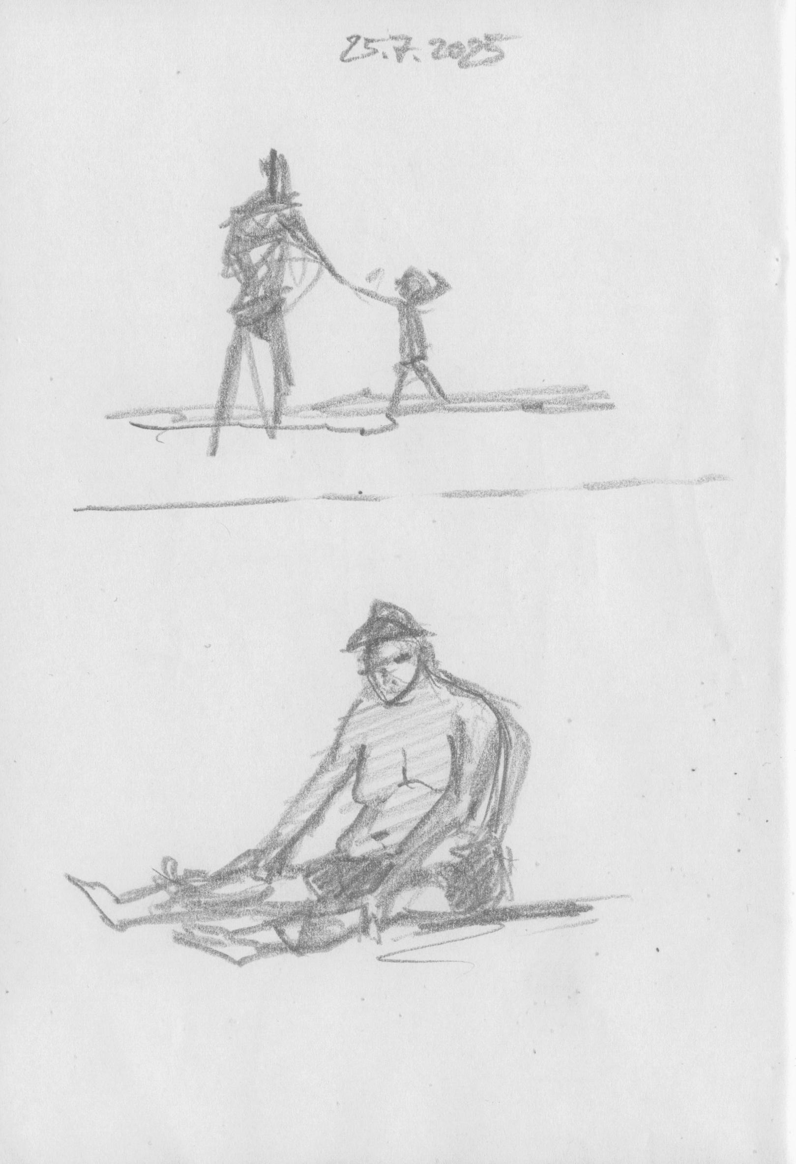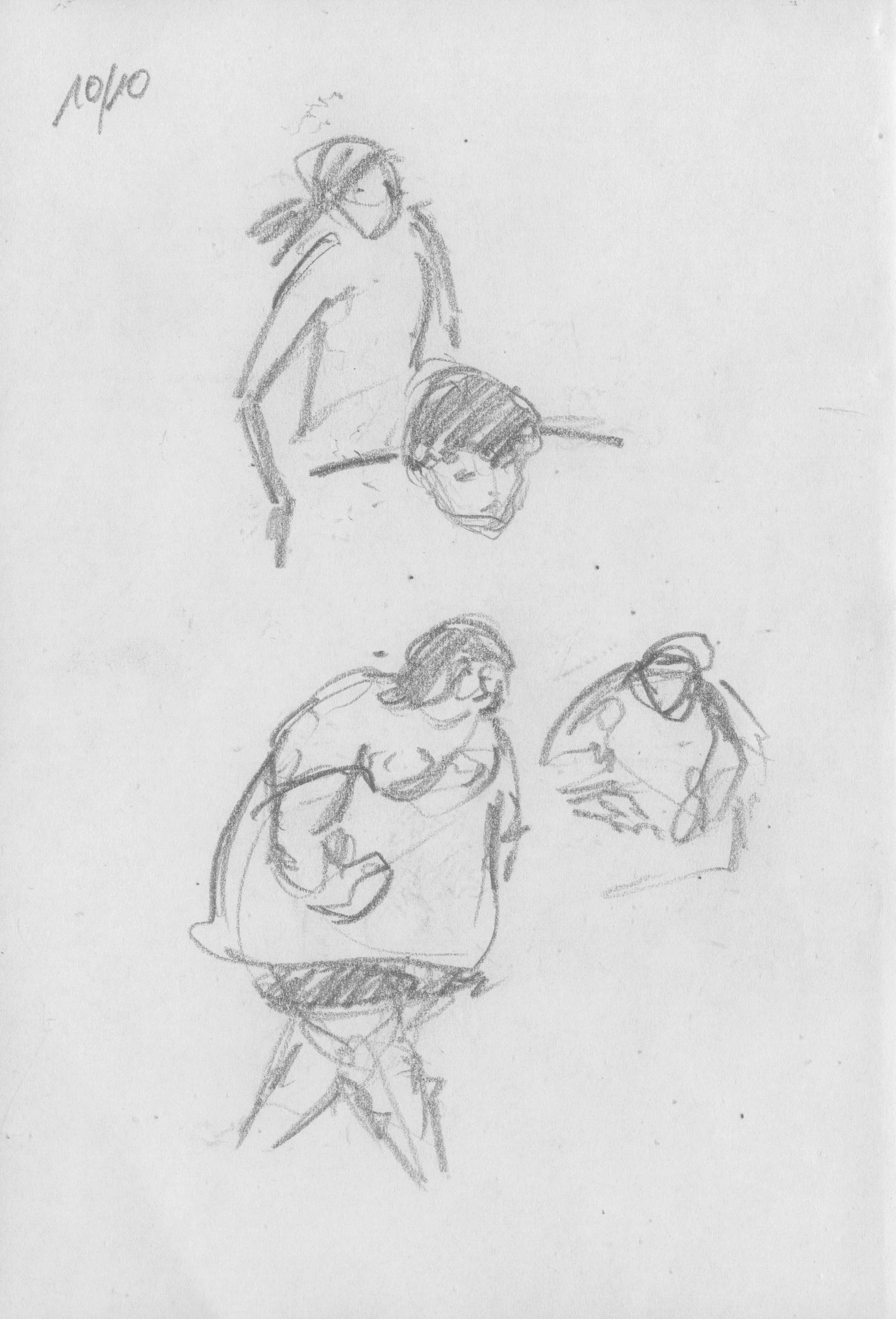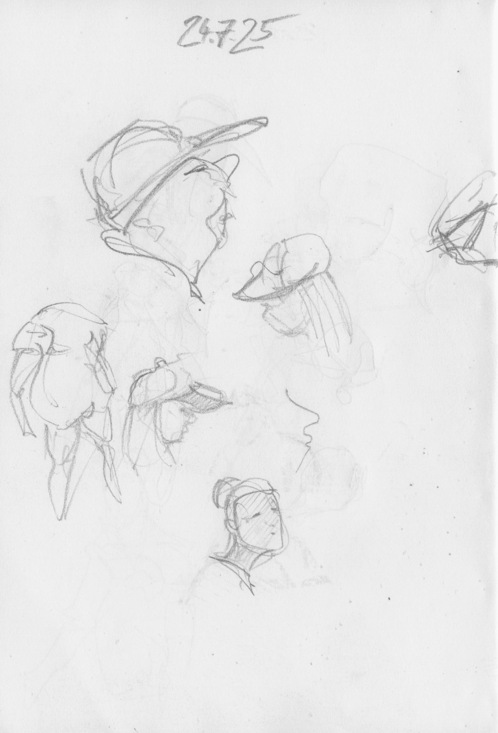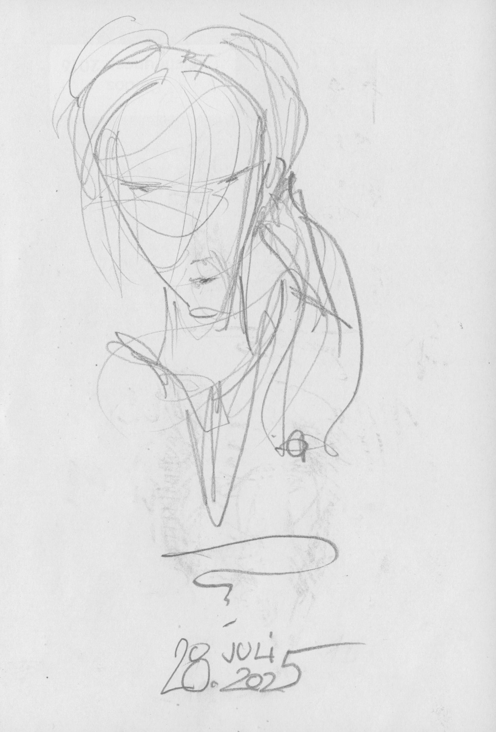 Die Skizzen habe ich durchweg live gezeichnet. Das ist bei den Menschenskizzen durchaus herausfordernd. Entspannend sind dann dagegen die Blindzeichnungen. Auch immer wieder gerne.