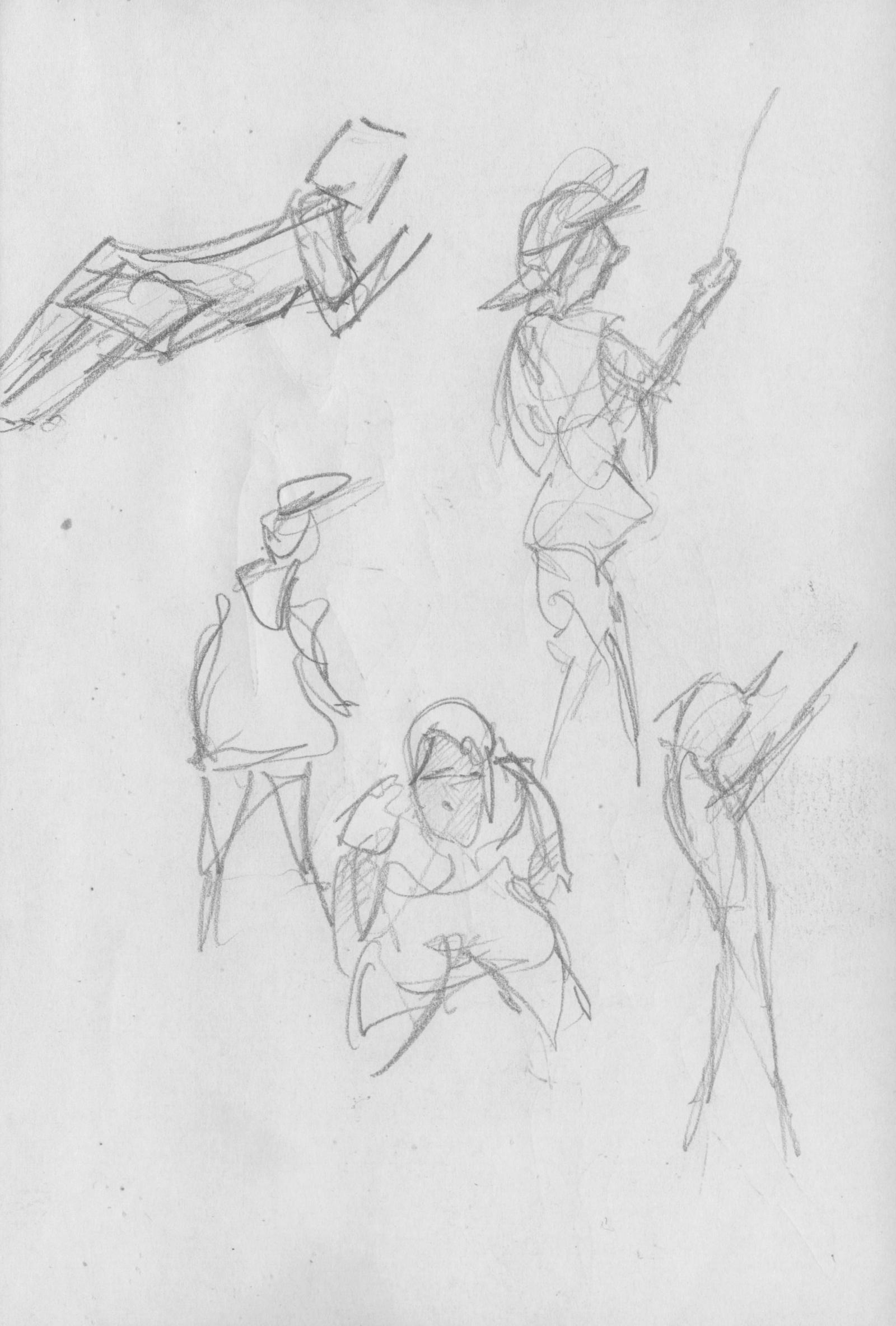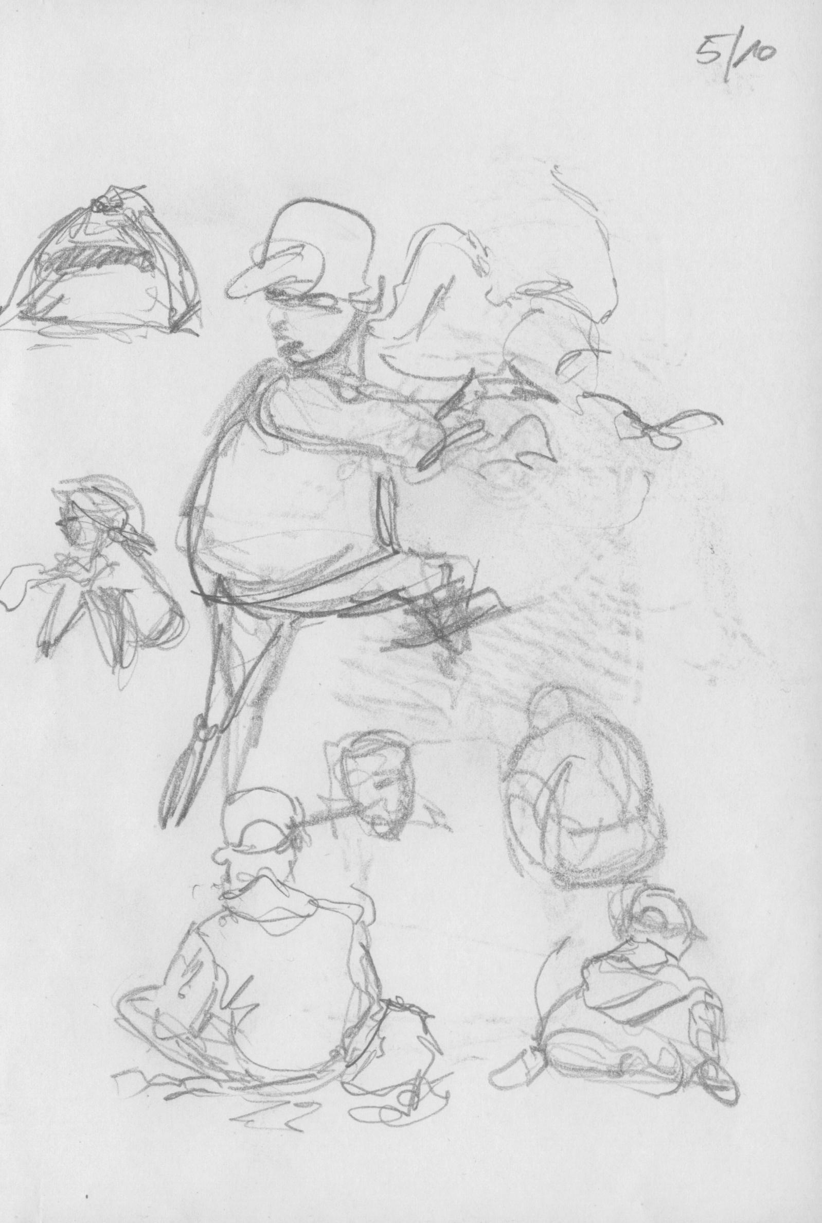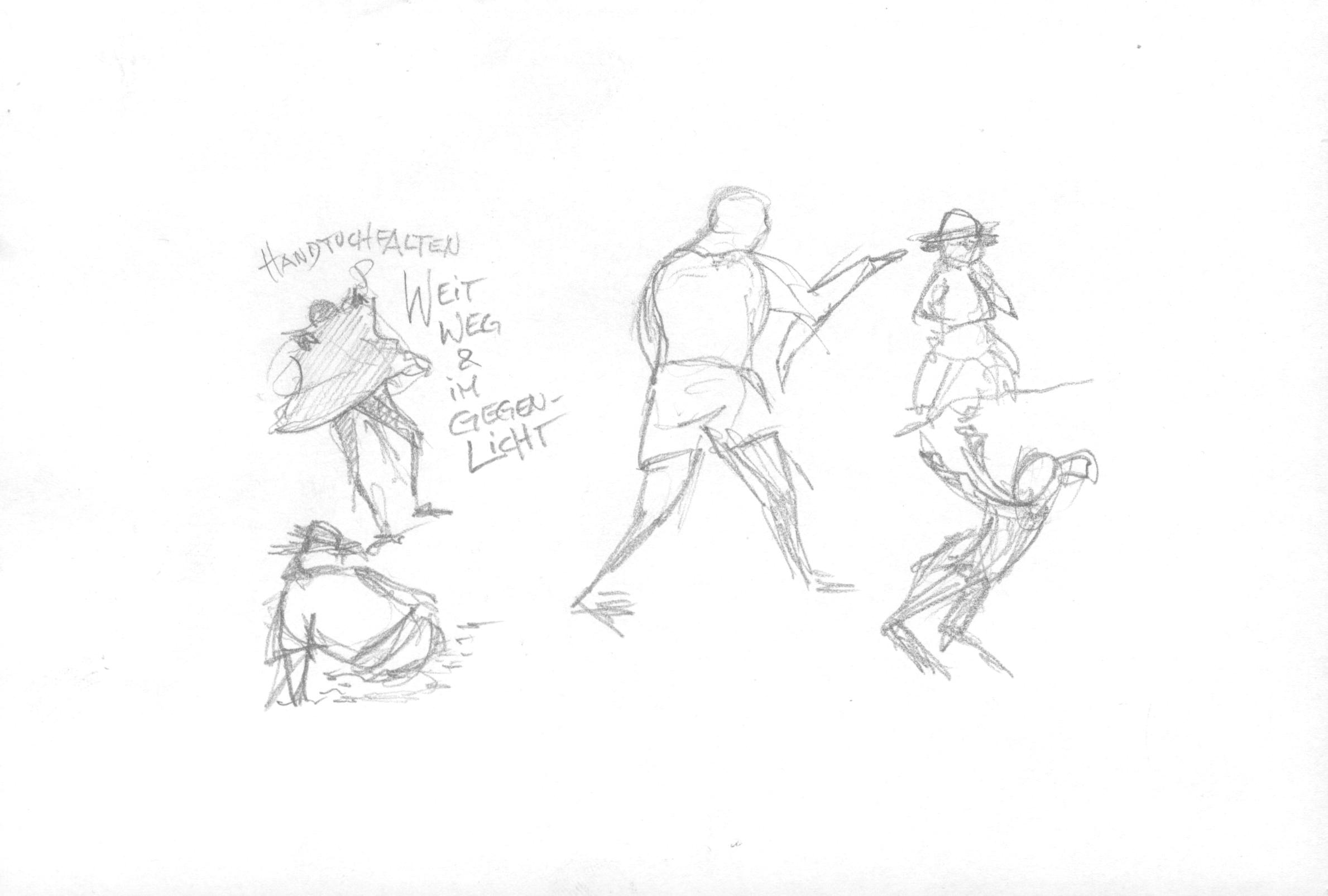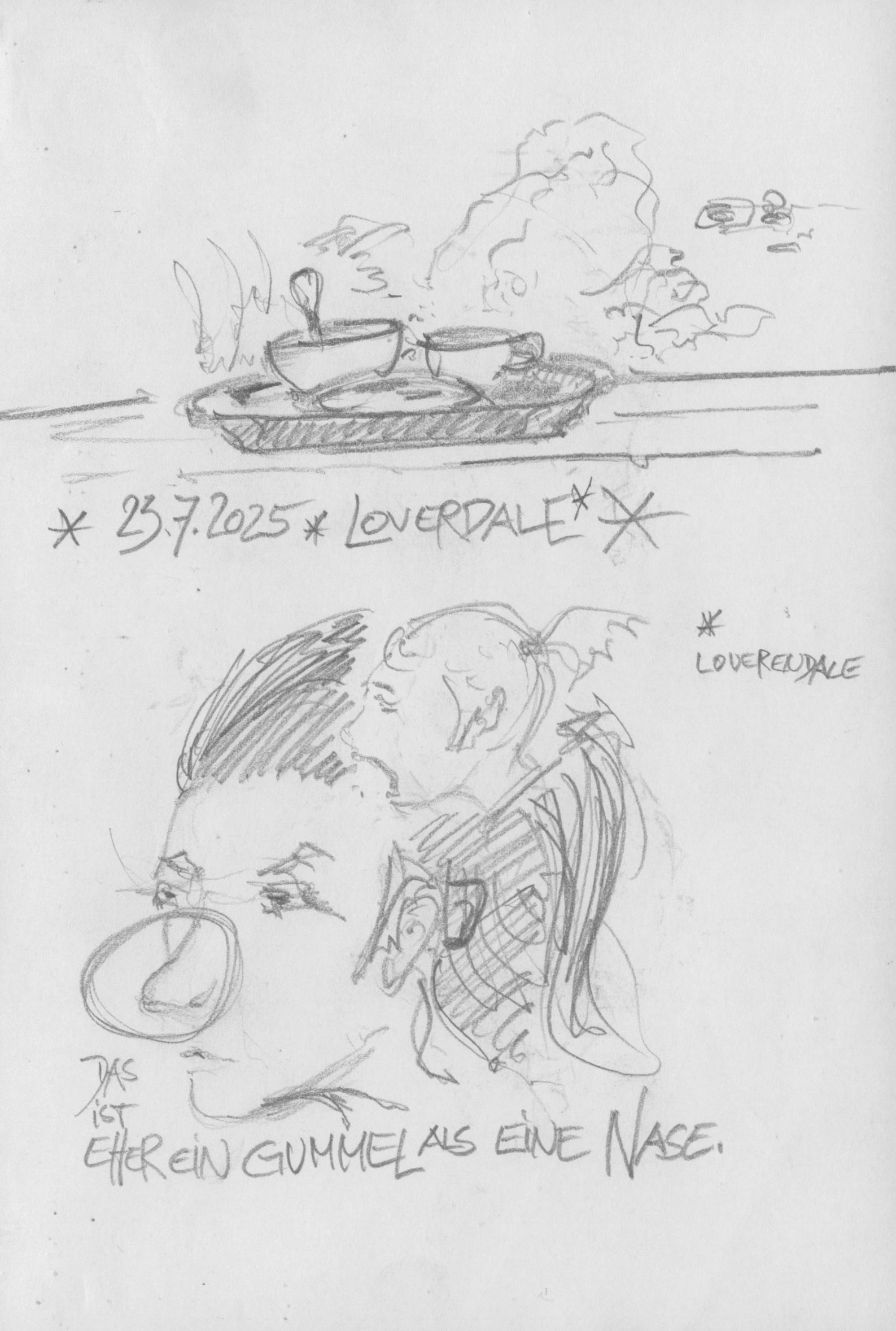 Die Skizzen habe ich durchweg live gezeichnet. Das ist bei den Menschenskizzen durchaus herausfordernd. Entspannend sind dann dagegen die Blindzeichnungen. Auch immer wieder gerne.