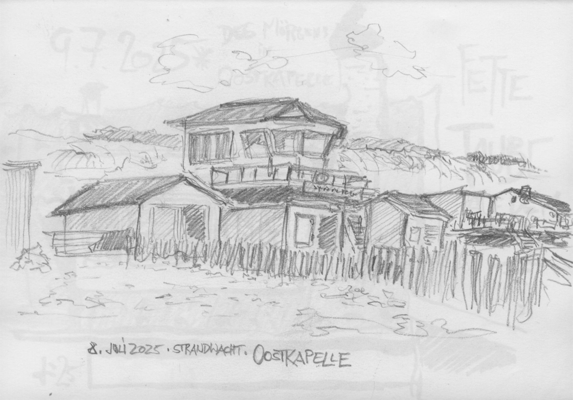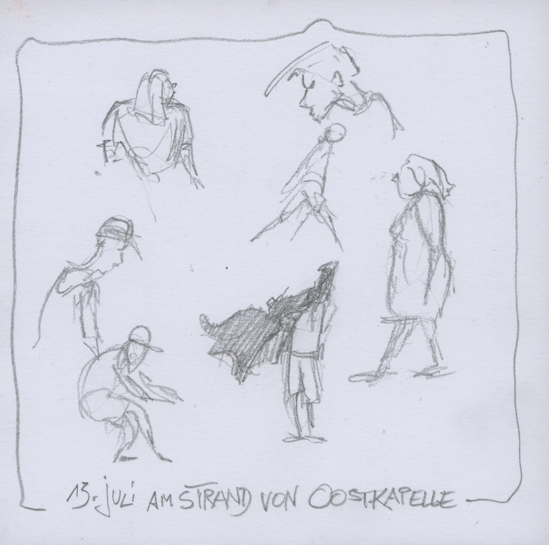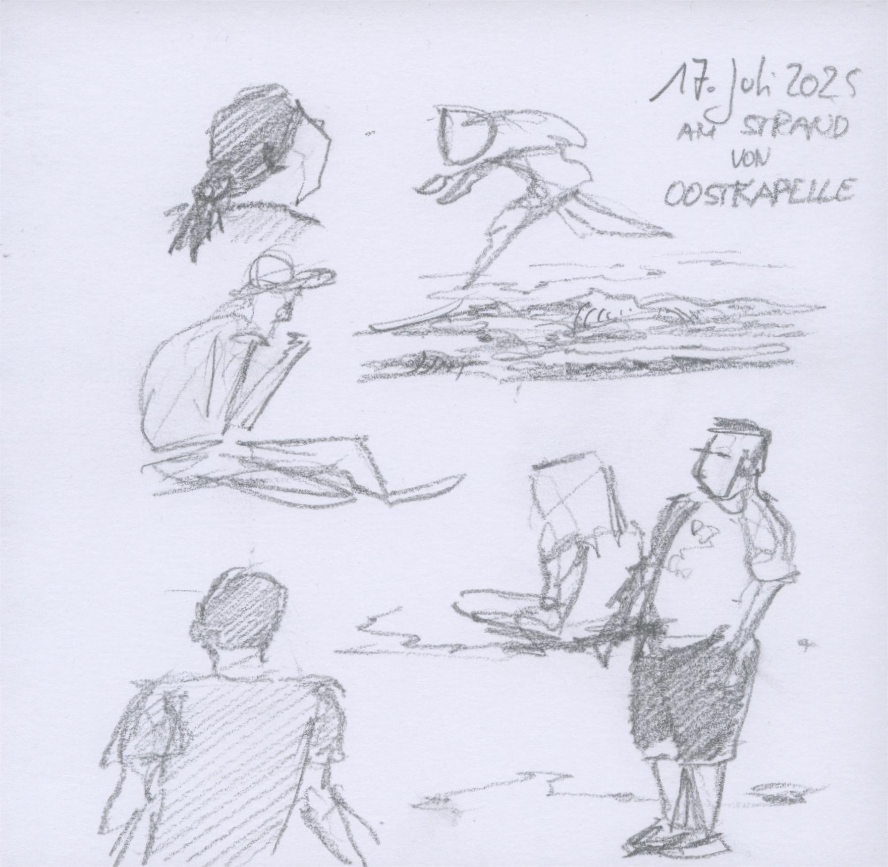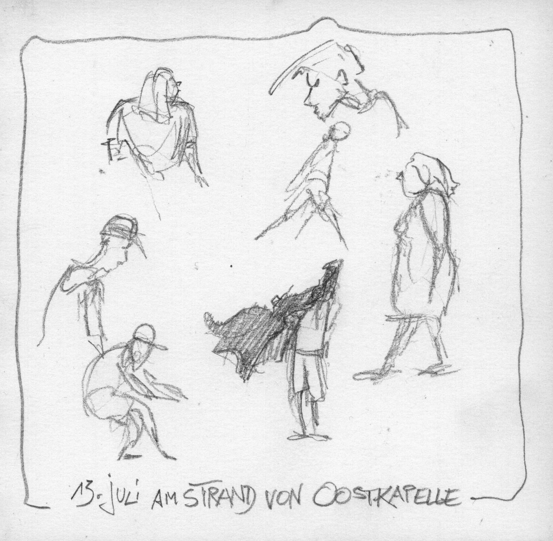 Urlaub auf Walcheren – ein Genuss! Ich hatte reichlich Gelegenheit, am Strand von Oostkapelle zu zeichnen. Aber auch in Middelburg, Domburg und an unserer Unterkunft habe ich den Stift bewegen können.