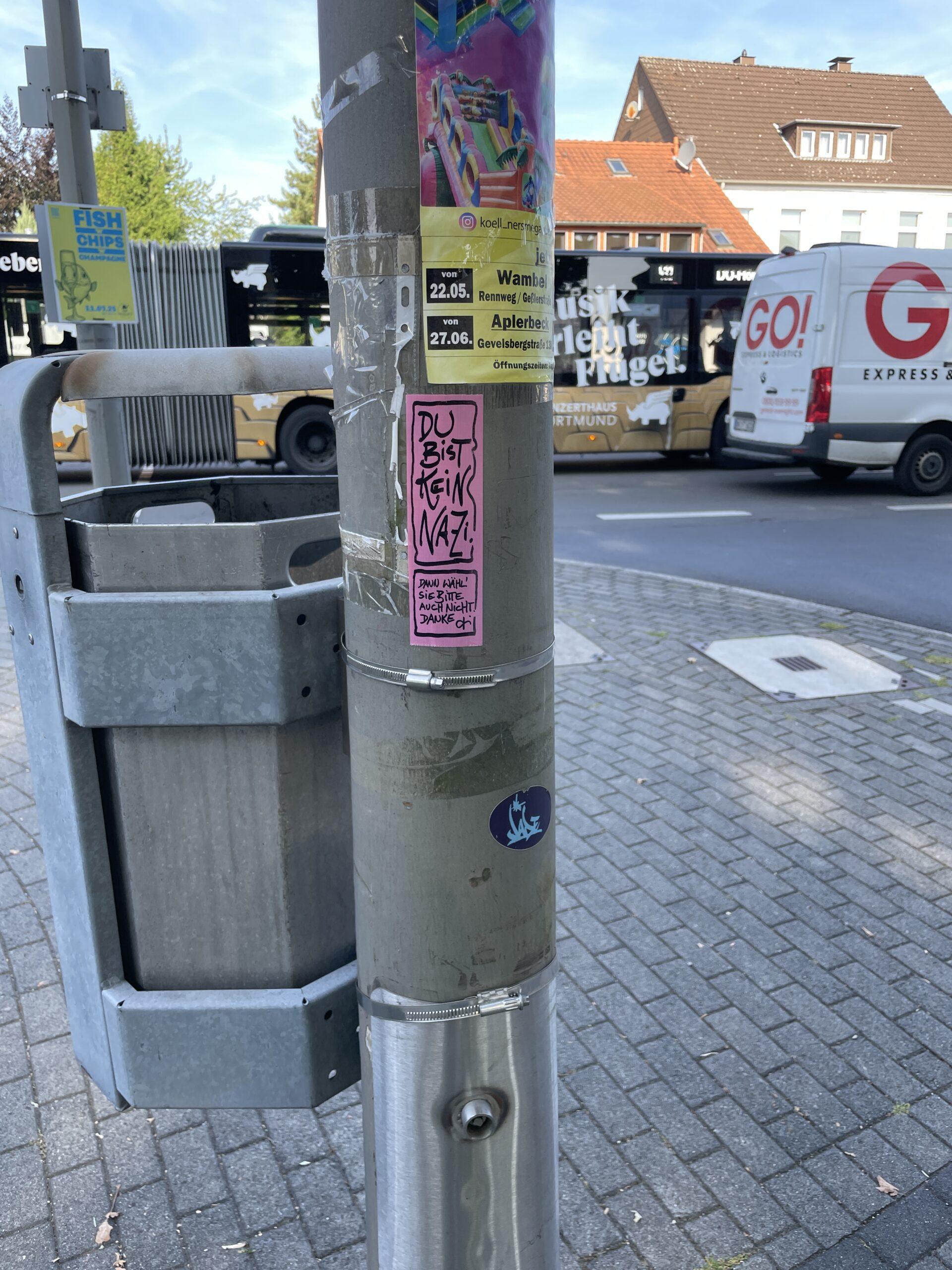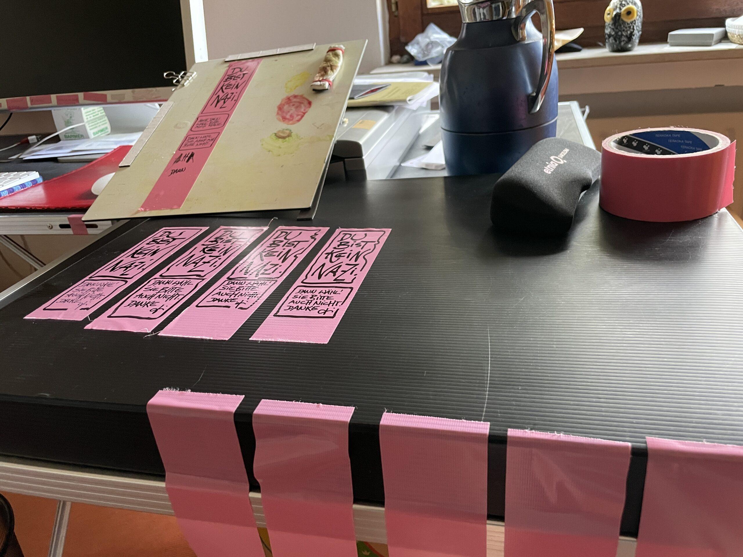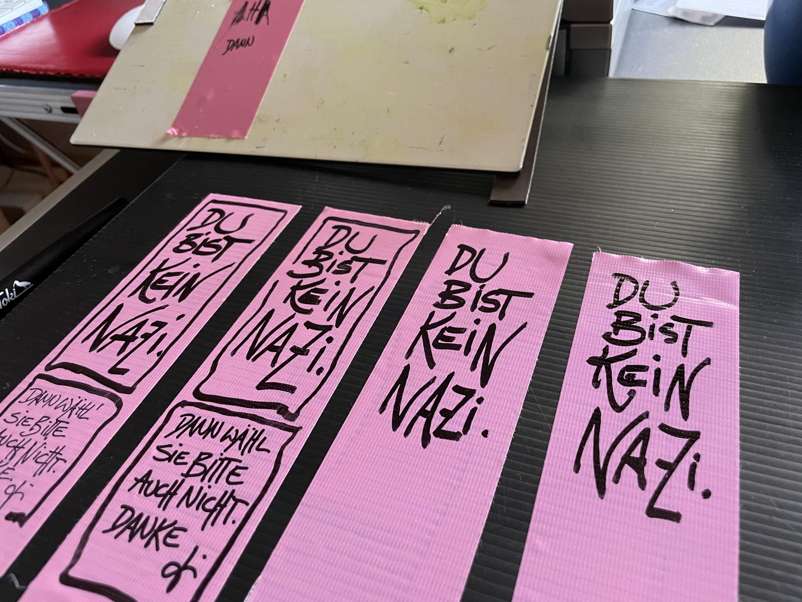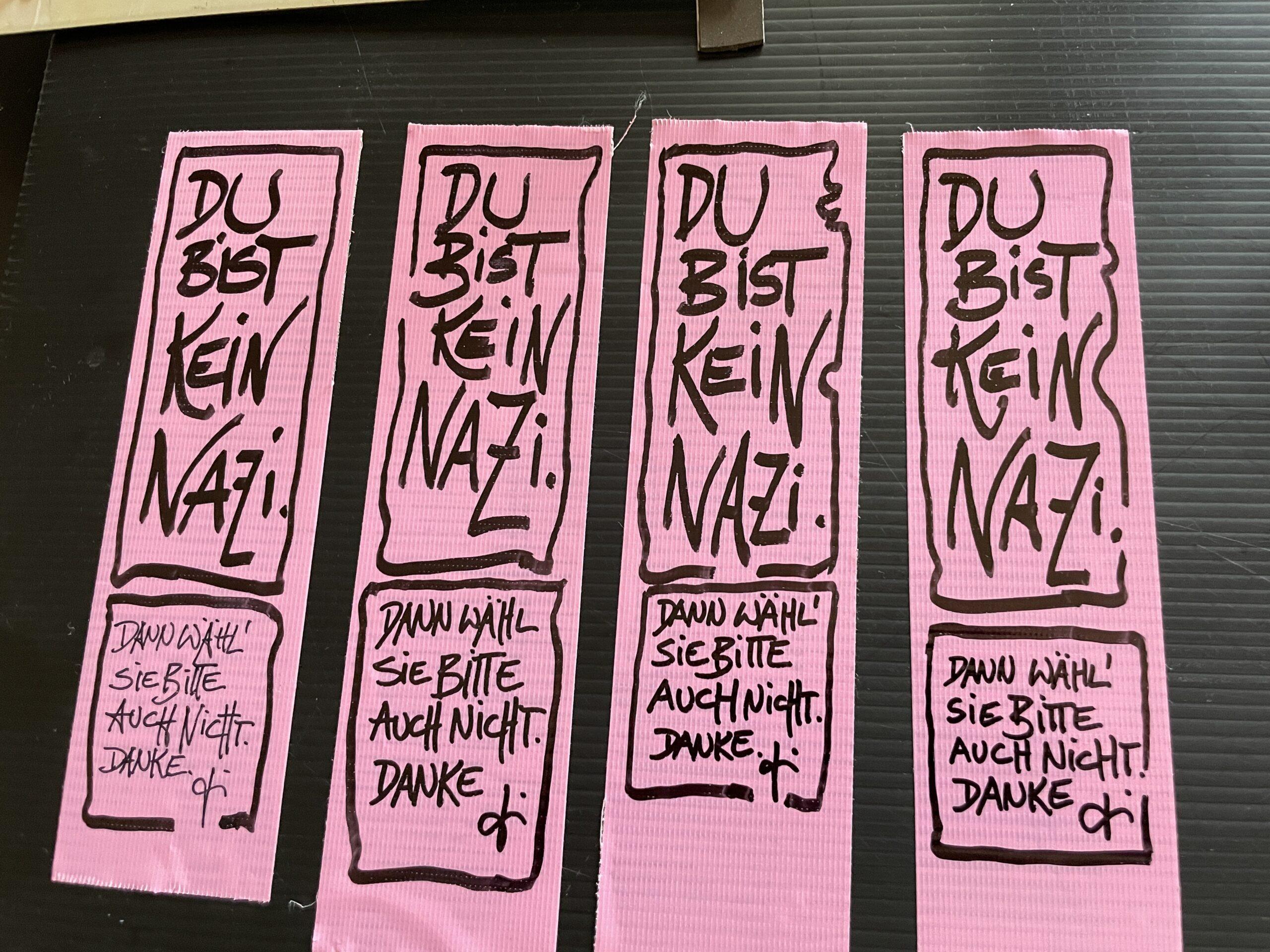 Diese Botschaft platziere ich an Pfählen mit Wahlwerbung. Jeder Aufkleber ist ein Unikat – geschrieben mit den Toki-Filzstiften.